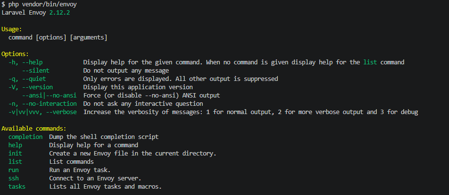 php vendor/bin/envoyIt will output the version and a list of available commands.